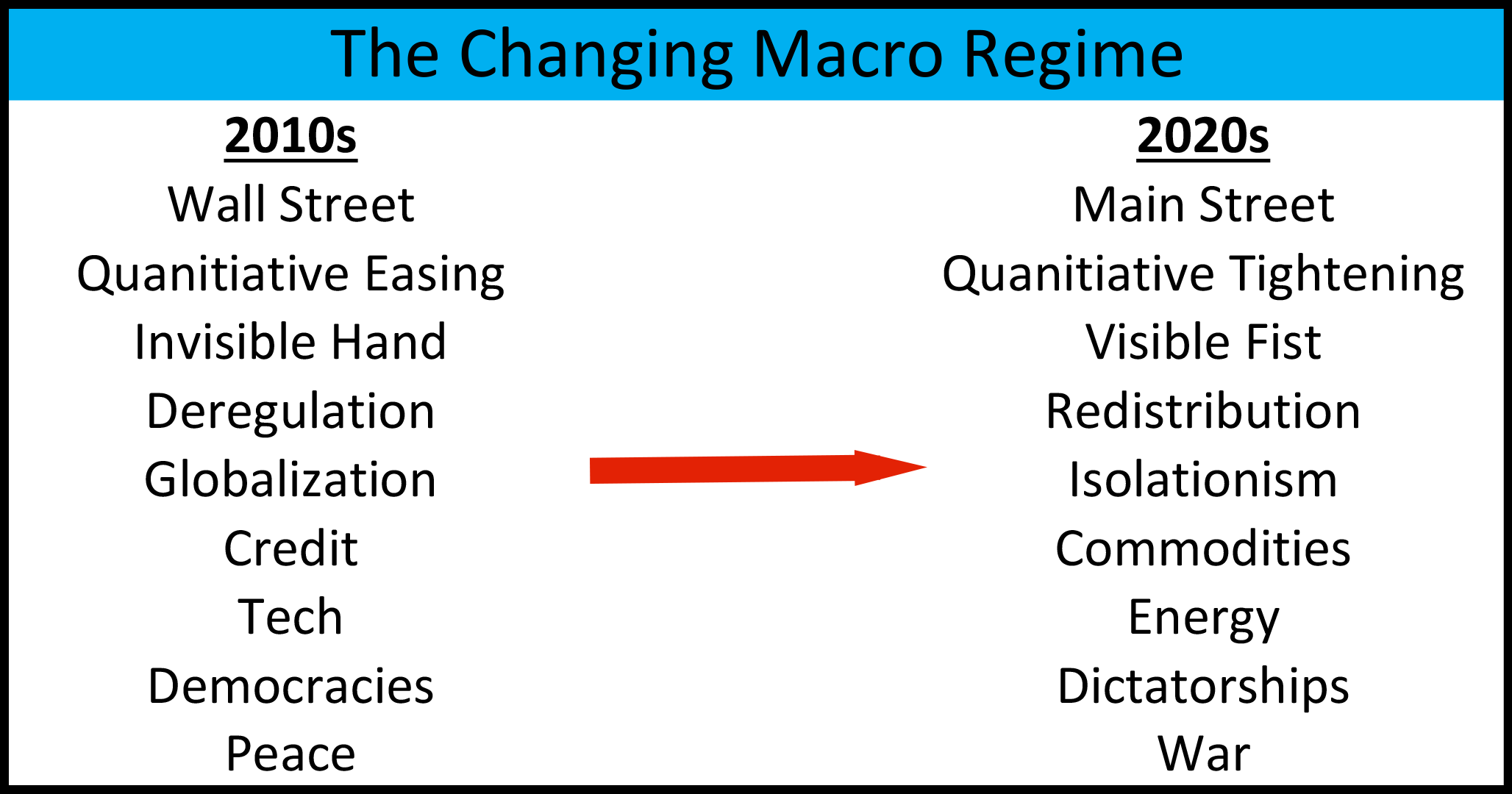So, what will the new macro regime look like? The graphic below summarizes how the major investment themes are shifting.