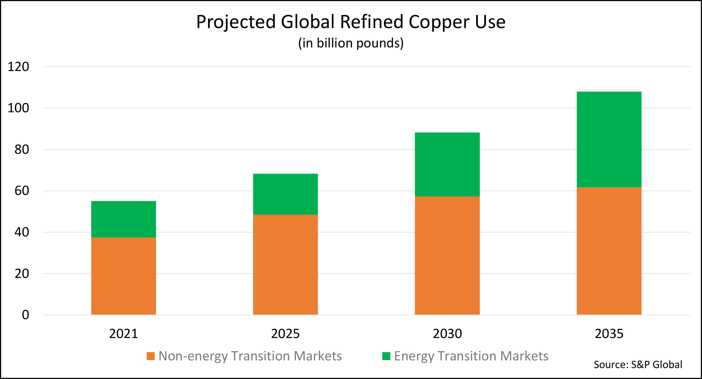 I won't drown you in a sea of numbers with all the other industries. I will just tell you that S&P Global, the company behind the S&P 500 and a well-respected provider of financial information, projects that by 2035, global copper demand will more than double from today's levels to around 108 billion pounds per year as the world pursues green energy in all its various forms.
