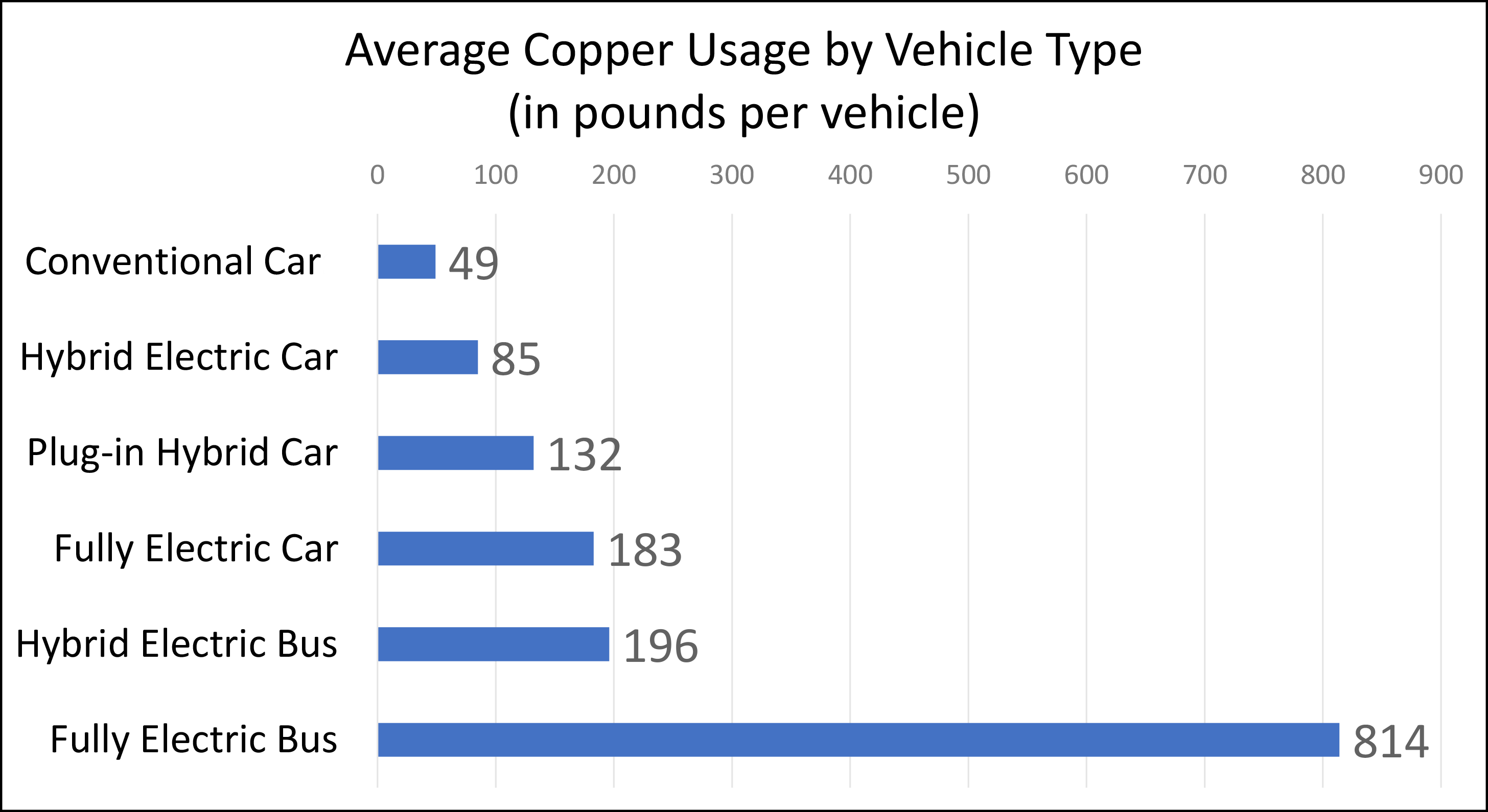 The chart below shows how much copper is used to manufacture these vehicles in comparison to traditional, fossil fuel-powered options. These data points on copper consumption come from the Copper Development Association, the engineering and information services arm of the copper industry: