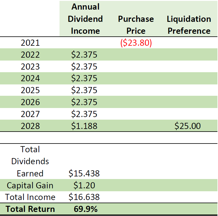 I say “if” because that’s another little quirk of preferred stock. Some of it is so-called “perpetual,” meaning it has no specific date on which a company can/will repurchase its preferred shares. It just exists for, basically, time immemorial—or until a company dies or merges with another company or whatnot.